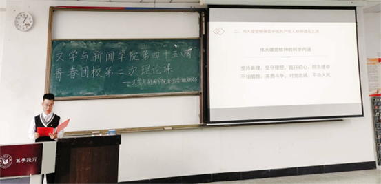 本网讯(文/何刘深 图/冯杰、何刘深)为了加强青年学生的思想政治教育,传承和弘扬以伟大建党精神为源头的中国共产党人精神谱系,11月14日,马克思主义学院“乐师红帆”理论宣讲团受文新学院邀请,在行知楼 325 教室开展“弘扬以伟大建党精神为源头的中国共产党人精神谱系”宣讲。本次宣讲由“乐师红帆”理论宣讲团成员冯杰、何刘深主讲,文新学院全体同学参与。