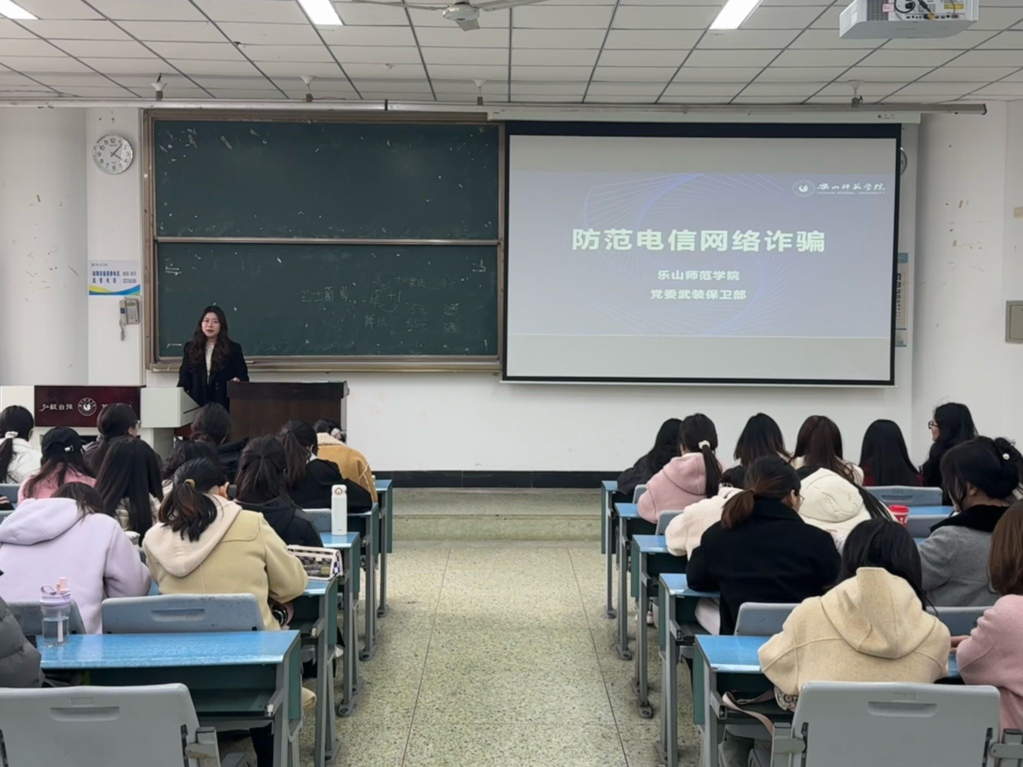 随后针对当前高发的电信网络诈骗案件,黄高静和刘蕾依托“AI换脸诈骗”“助学金钓鱼链接”等真实案例,深入剖析“刷单返利”“虚假购物”“冒充熟人”等常见诈骗手段,并呼吁全体学生做到“三不”:不轻信、不透露、不转账,切实提升反诈意识与应对能力。