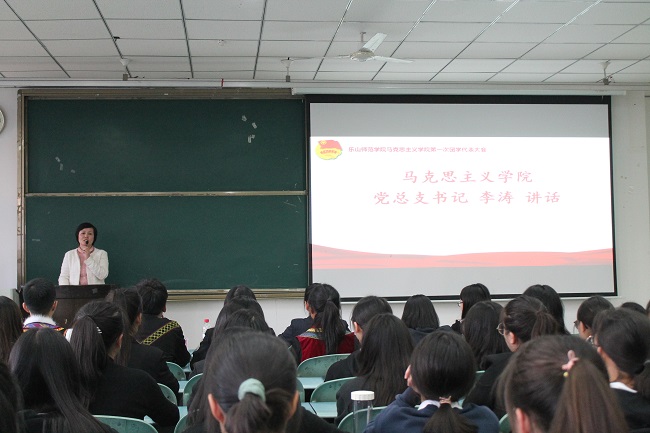 (图/魏鑫 文/杨玥)马克思主义学院于11月19日下午在行知楼101举行了第一次团学代表大会,马克思主义学院党总支书记李涛、辅导员张红丽、专任教师兼职辅导员何源以及123名团员代表参与此次大会,会议由吴笛主持。