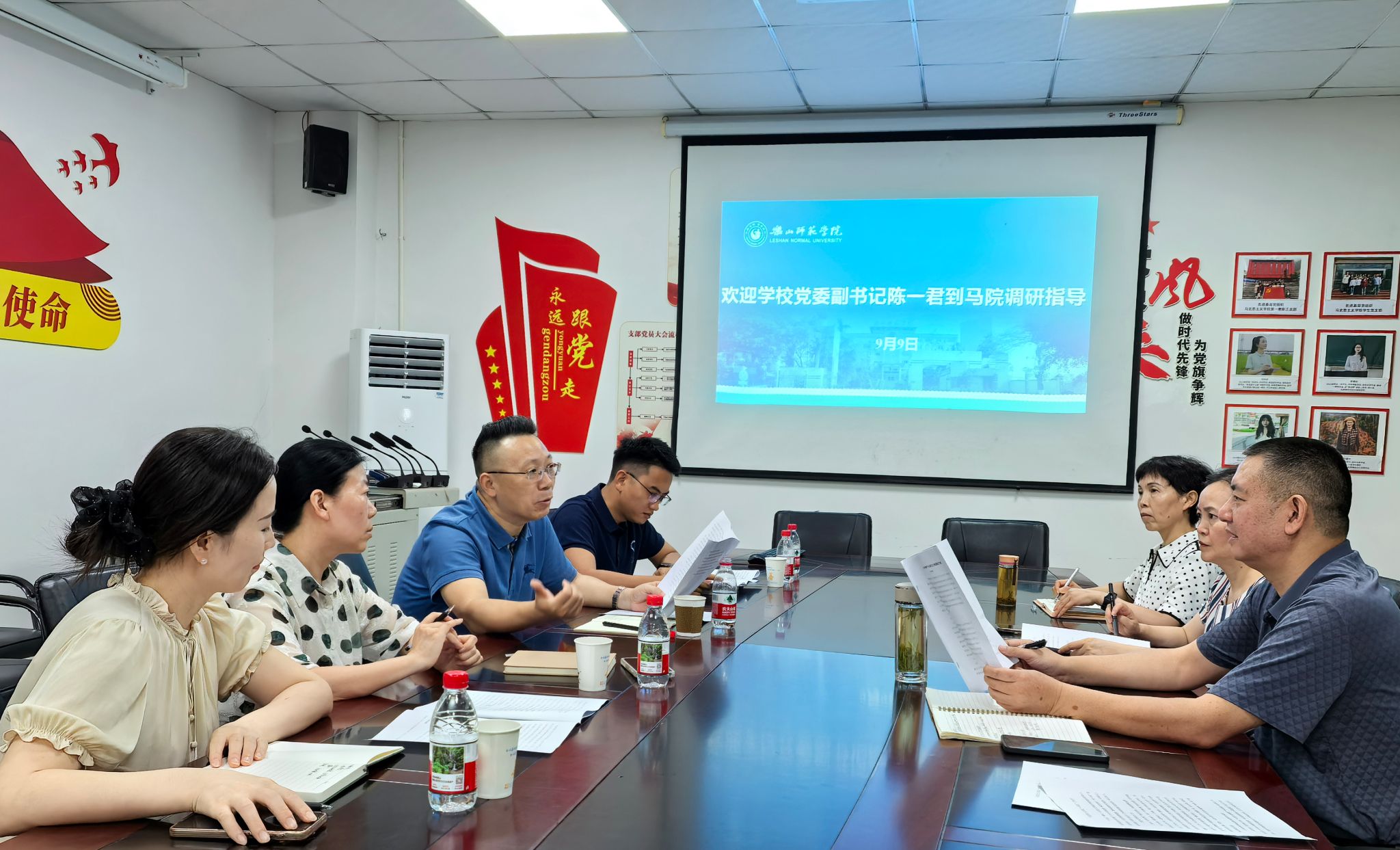本网讯(文图/郭晖)2025年9月9日,学校党委副书记陈一君到马院调研指导工作,人事部、组织部、宣传部等相关人员陪同参加调研。马克思主义学院党委书记李涛、院长郑文杰、党委副书记钟永淑一同参会。